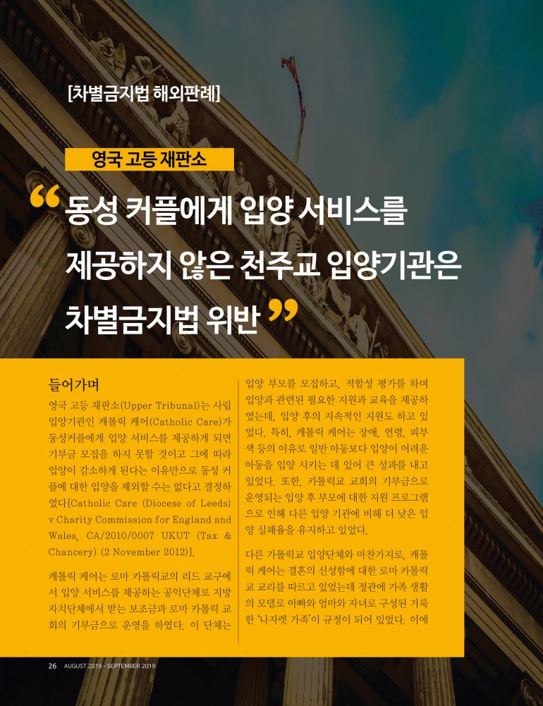 영국 고등 재판소(Upper Tribunal)는 사립 입양기관인 캐톨릭 케어(Catholic Care)가 동성커플에게 입양 서비스를 제공하게 되면 기부금 모집을 하지 못할 것이고 그에 따라 입양이 감소하게 된다는 이유만으로 동성 커 플에 대한 입양을 제외할 수는 없다고 결정하 였다[Catholic Care (Diocese of Leeds) v Charity Commission for England and Wales, CA/2010/0007 UKUT (Tax & Chancery) (2 November 2012)].