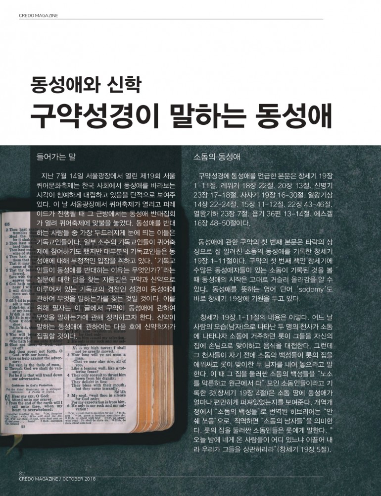 지난 7월 14일 서울광장에서 열린 제19회 서울 퀴어문화축제는 한국 사회에서 동성애를 바라보는 시각이 첨예하게 대립하고 있음을 단적으로 보여주었다. 이 날 서울광장에서 퀴어축제가 열리고 퍼레이드가 진행될 때 그 근방에서는 동성애 반대집회가 열려 퀴어축제에 맞불을 놓았다. 동성애를 반대 하는 사람들 중 가장 두드러지게 눈에 띄는 이들은 기독교인들이다. 일부 소수의 기독교인들이 퀴어축제에 참여하기도 했지만 대부분의 기독교인들은 동성애에 대해 부정적인 입장을 취하고 있다. ‘기독교 인들이 동성애를 반대하는 이유는 무엇인가?’라는 질문에 대한 답을 찾는 지름길은 구약과 신약으로 이루어져 있는 기독교의 경전인 성경이 동성애에 관하여 무엇을 말하는가를 찾는 것일 것이다. 이를 위해 필자는 이 글에서 구약이 동성애에 관하여 무엇을 말하는가에 관해 정리하고자 한다. 신약이 말하는 동성애에 관하여는 다음 호에 신약학자가 집필할 것이다.