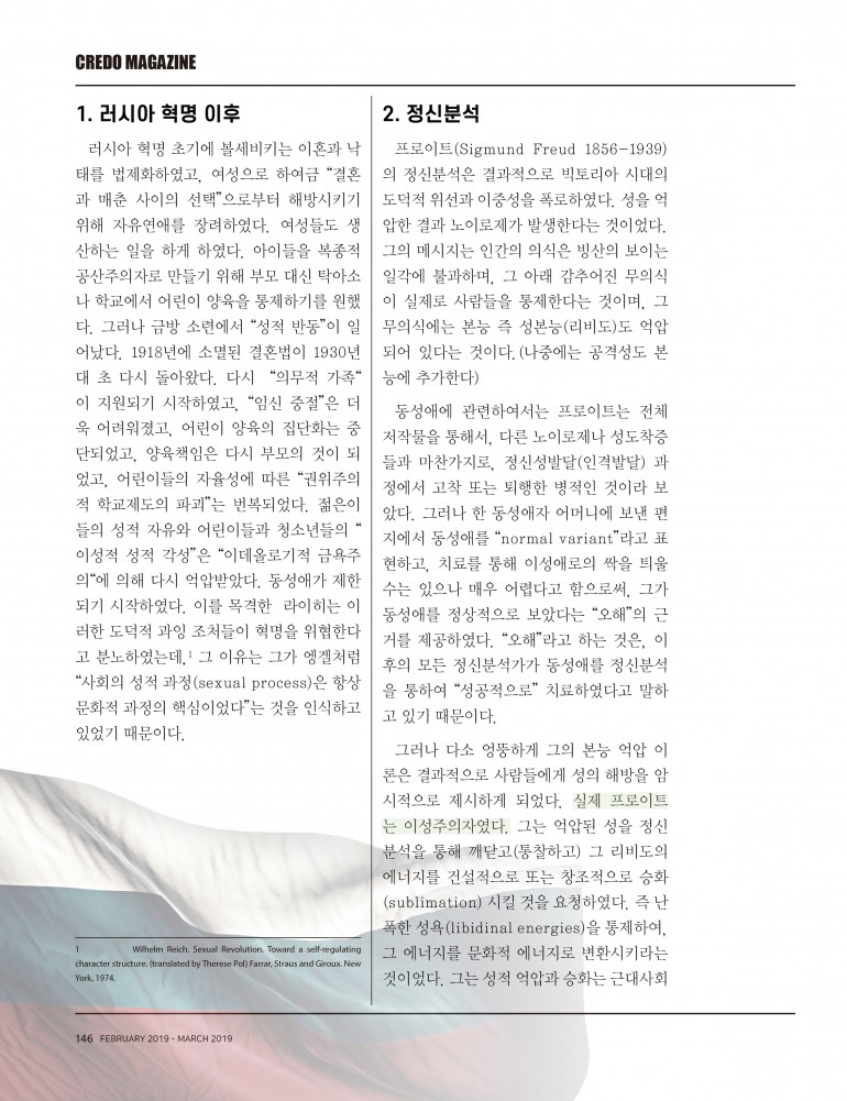 러시아 혁명 초기에 볼세비키는 이혼과 낙태를 법제화하였고, 여성으로 하여금 “결혼과 매춘 사이의 선택”으로부터 해방시키기 위해 자유연애를 장려하였다. 여성들도 생산하는 일을 하게 하였다. 아이들을 복종적 공산주의자로 만들기 위해 부모 대신 탁아소나 학교에서 어린이 양육을 통제하기를 원했다. 그러나 금방 소련에서 “성적 반동”이 일어났다. 1918년에 소멸된 결혼법이 1930년 대 초 다시 돌아왔다. 다시 “의무적 가족“ 이 지원되기 시작하였고, “임신 중절”은 더욱 어려워졌고, 어린이 양육의 집단화는 중단되었고, 양육책임은 다시 부모의 것이 되었고, 어린이들의 자율성에 따른 “권위주의적 학교제도의 파괴”는 번복되었다. 젊은이들의 성적 자유와 어린이들과 청소년들의 “이성적 성적 각성”은“ 이데올로기적 금욕주의“에 의해 다시 억압받았다. 동성애가 제한 되기 시작하였다. 이를 목격한 라이히는 이러한 도덕적 과잉 조처들이 혁명을 위협한다고 분노하였는데, 그 이유는 그가 엥겔처럼 “사회의 성적 과정(sexual process)은 항상 문화적 과정의 핵심이었다”는 것을 인식하고 있었기 때문이다.