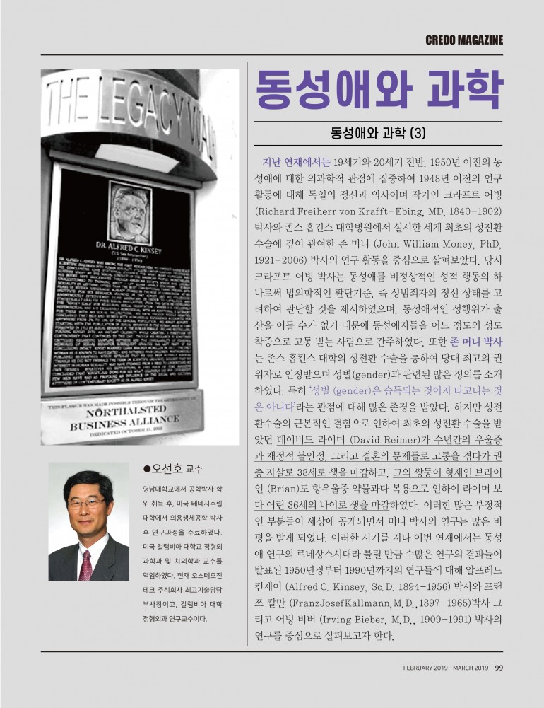 지난 연재에서는 19세기와 20세기 전반, 1950년 이전의 동성애에 대한 의과학적 관점에 집중하여 1948년 이전의 연구 활동에 대해 독일의 정신과 의사이며 작가인 크라프트 어빙 (Richard Freiherr von Krafft-Ebing, MD, 1840-1902) 박사와 존스 홉킨스 대학병원에서 실시한 세계 최초의 성전환 수술에 깊이 관여한 존 머니 (John William Money, PhD, 1921-2006) 박사의 연구 활동을 중심으로 살펴보았다. 당시 크라프트 어빙 박사는 동성애를 비정상적인 성적 행동의 하나로써 법의학적인 판단기준, 즉 성범죄자의 정신상태를 고려하여 판단할 것을 제시하였으며, 동성애적인 성행위가 출산을 이룰 수가 없기 때문에 동성애자들을 어느 정도의 성도착증으로 고통 받는 사람으로 간주하였다.