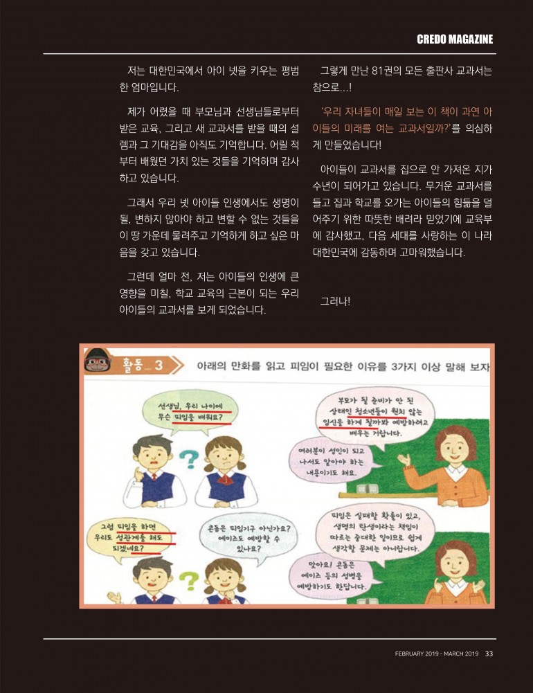 그런데 얼마 전, 저는 아이들의 인생에 큰 영향을 미칠, 학교 교육의 근본이 되는 우리 아이들의 교과서를 보게 되었습니다.