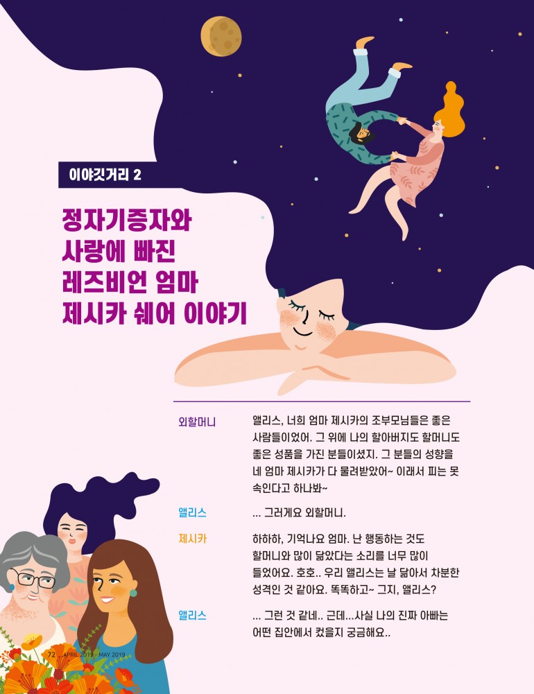 할머니와 엄마 제시카의 대화를 듣던 앨리스는 조용해졌다. 그 이유는 자신의 50%는 이 집안과 상관이 없기 때문이었다. 앨리스는 아빠가 없이 엄마가 둘인 집안에서 태어났다.