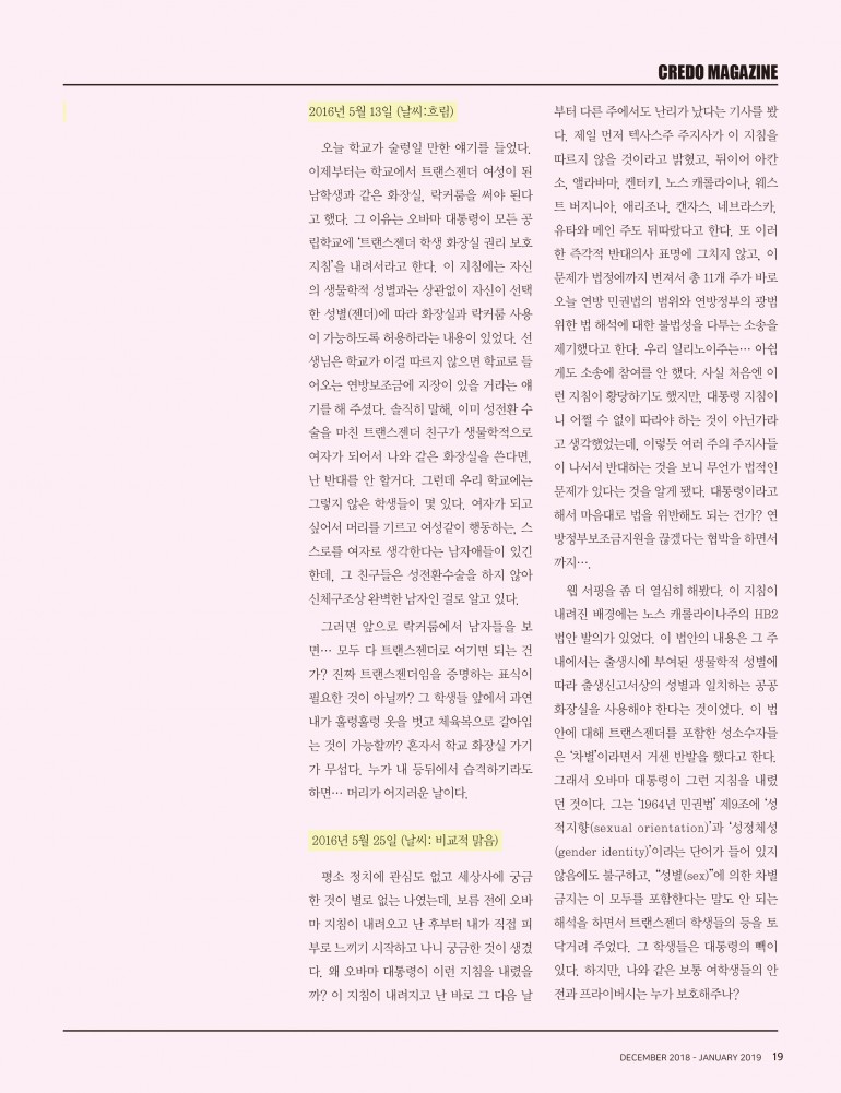 오늘 학교가 술렁일 만한 얘기를 들었다. 이제부터는 학교에서 트랜스젠더 여성이 된 남학생과 같은 화장실, 락커룸을 써야 된다 고 했다. 그 이유는 오바마 대통령이 모든 공 립학교에 ‘트랜스젠더 학생 화장실 권리 보호 지침’을 내려서라고 한다. 이 지침에는 자신 의 생물학적 성별과는 상관없이 자신이 선택 한 성별(젠더)에 따라 화장실과 락커룸 사용 이 가능하도록 허용하라는 내용이 있었다. 선 생님은 학교가 이걸 따르지 않으면 학교로 들 어오는 연방보조금에 지장이 있을 거라는 얘 기를 해 주셨다. 솔직히 말해, 이미 성전환 수 술을 마친 트랜스젠더 친구가 생물학적으로 여자가 되어서 나와 같은 화장실을 쓴다면, 난 반대를 안 할거다. 그런데 우리 학교에는 그렇지 않은 학생들이 몇 있다. 여자가 되고 싶어서 머리를 기르고 여성같이 행동하는, 스 스로를 여자로 생각한다는 남자애들이 있긴 한데, 그 친구들은 성전환수술을 하지 않아 신체구조상 완벽한 남자인 걸로 알고 있다.