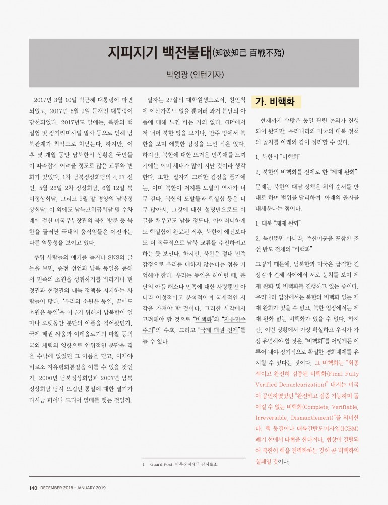 2017년 3월 10일 박근혜 대통령이 파면 되었고, 2017년 5월 9일 문재인 대통령이 당선되었다. 2017년도 말에는, 북한의 핵 실험 및 장거리미사일 발사 등으로 인해 남 북관계가 최악으로 치닫는다. 하지만, 이 후 몇 개월 동안 남북한의 상황은 국민들 이 따라잡기 어려울 정도로 많은 교류와 변 화가 있었다. 1차 남북정상회담의 4.27 선 언, 5월 26일 2차 정상회담, 6월 12일 북 미정상회담, 그리고 9월 말 평양의 남북정 상회담. 이 외에도 남북고위급회담 및 수차 례에 걸친 미국무부장관의 북한 방문 등 북 한을 둘러싼 국내외 움직임들은 이전과는 다른 역동성을 보이고 있다.