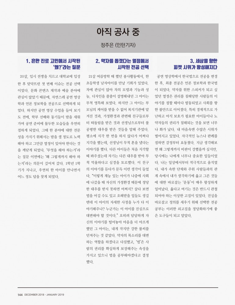 20살, 입시 전쟁을 치르고 대학교에 입성 한 후 맞닥뜨린 첫 번째 이슈는 전공 선택 이었다. 문화 콘텐츠 제작과 예술 분야에 관심이 많았기 때문에, 자연스레 공연 영상 학과 언론 정보학을 전공으로 선택하게 되 었다. 하지만 공연 영상 수업을 들어 보기 도 전에, 학부 선배와 동기들이 밤을 새워 가며 공연 준비에 몰두한 모습들을 우연히 접하게 되었다. 그때 한 분야에 대한 전문 성을 가지기 위해서는 밤을 샐 정도로 노력 해야 하고 그만큼 열정이 있어야 한다는 것 을 깨닫게 되었다. ‘무엇을 해야 하는가’라 는 질문 이면에는 ‘왜 그렇게까지 해야 하 는지’라는 의문이 깊어져 갔다. 1학년 1학 기가 지나고, 우연히 한 아이를 만나면서 어느 정도 답을 찾게 되었다.