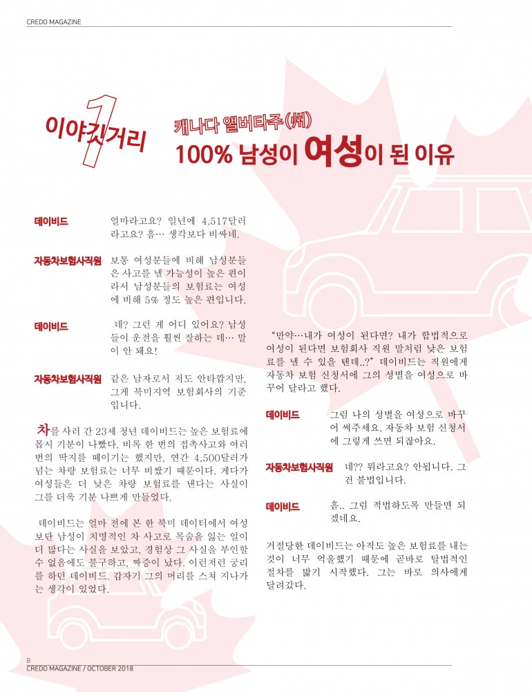 차를 사러 간 23세 청년 데이비드는 높은 보험료에 몹시 기분이 나빴다. 비록 한 번의 접촉사고와 여러 번의 딱지를 떼이기는 했지만, 연간 4,500달러가 넘는 차량 보험료는 너무 비쌌기 때문이다. 게다가 여성들은 더 낮은 차량 보험료를 낸다는 사실이 그를 더욱 기분 나쁘게 만들었다.