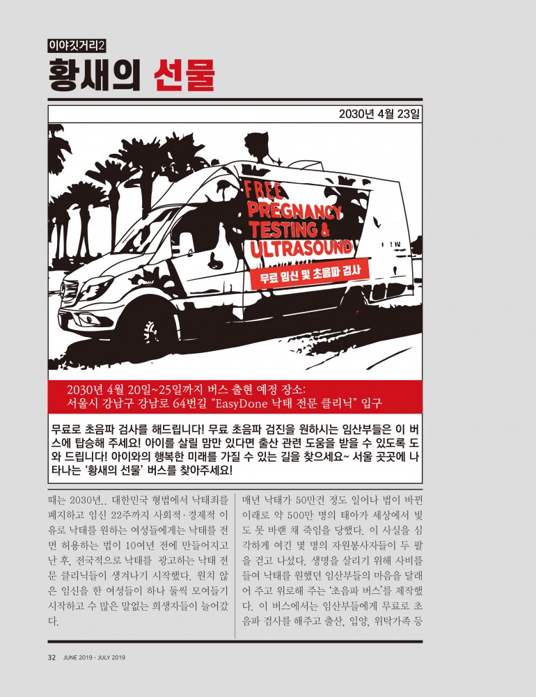 무료로 초음파 검사를 해드립니다! 무료 초음파 검진을 원하시는 임산부들은 이 버스에 탑승해 주세요! 아이를 살릴 맘만 있다면 출산 관련 도움을 받을 수 있도록 도와 드립니다! 아이와의 행복한 미래를 가질 수 있는 길을 찾으세요~ 서울 곳곳에 나타나는 ‘황새의 선물’ 버스를 찾아주세요!