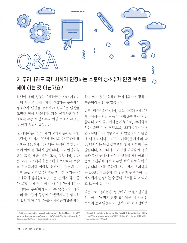 작년에 우리 정부는 “선진국을 따라 가려는 것이 아니고 국제사회가 인정하는 수준에서 성소수자 인권을 보호해야 한다.”는 입장을 표명한 적이 있습니다.